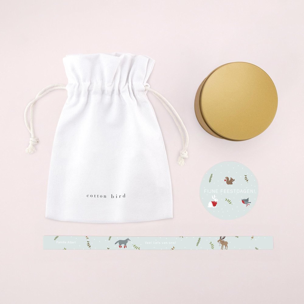 De geurkaarsen worden bezorgd in een katoenen hoesje, samen met twee labeltjes die je zelf kan opmaken en bevestigen op de geurkaars.