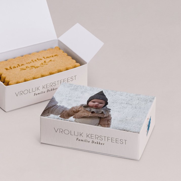 De koekjesdoos is speciaal ontworpen en gemaakt om jullie familie en vrienden te verrassen met een smakelijk cadeautje! Personaliseer het doosje met een lief berichtje, foto of jullie namen.
