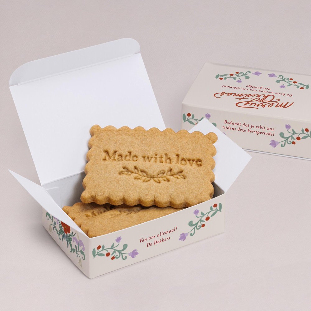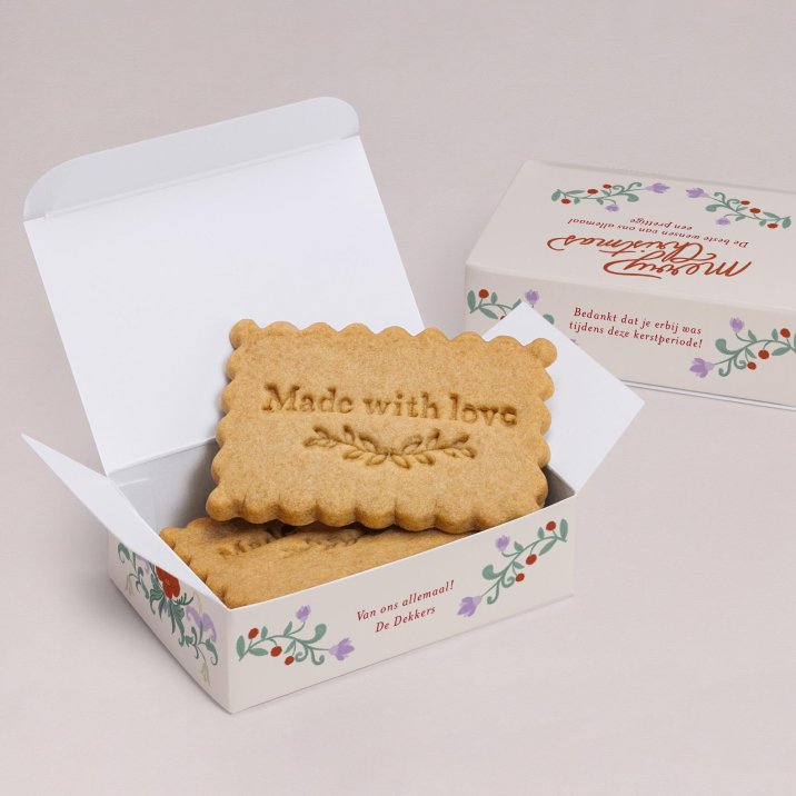 De koekjesdoos is speciaal ontworpen en gemaakt om jullie familie en vrienden te verrassen met een smakelijk cadeautje! Personaliseer het doosje met een lief berichtje, foto of jullie namen.