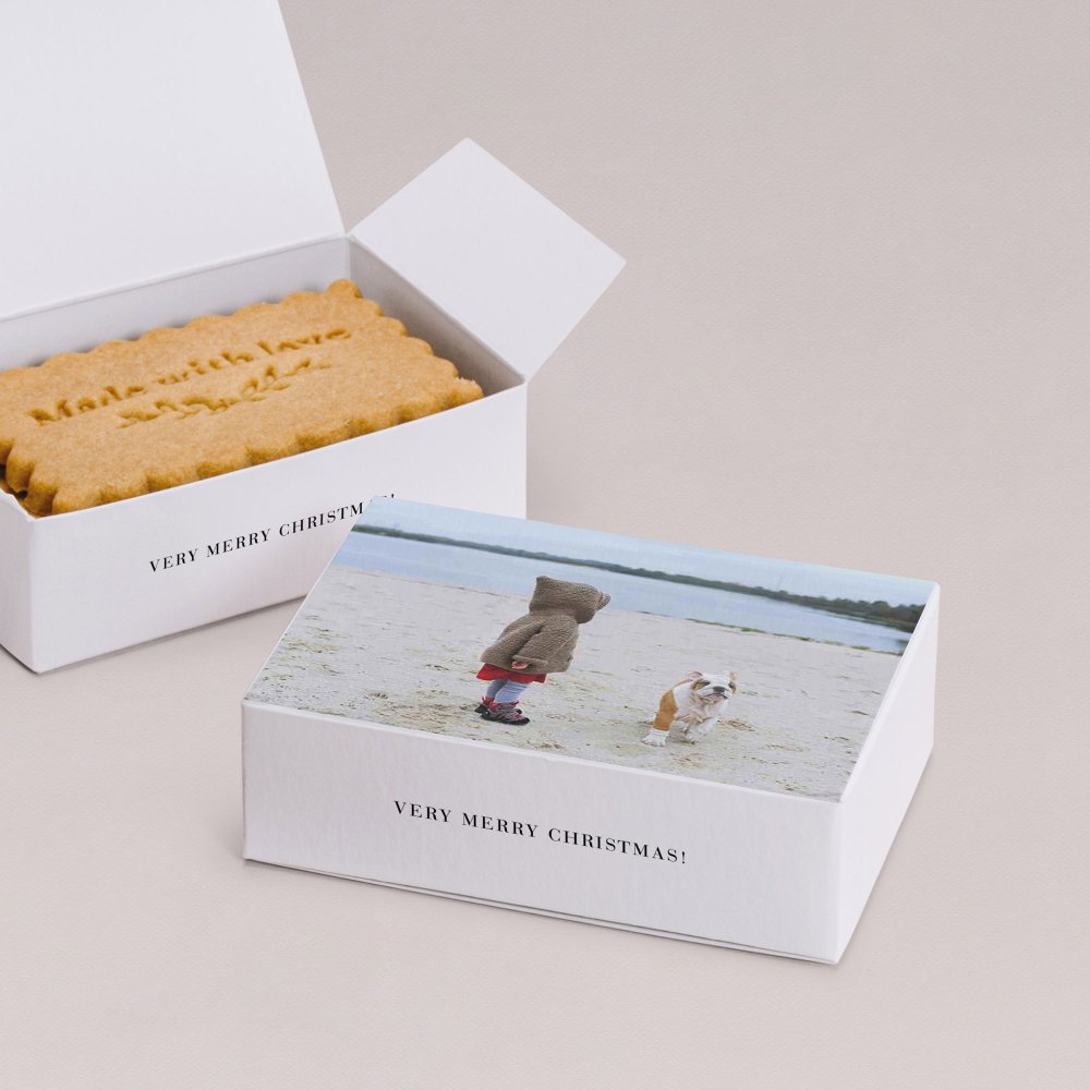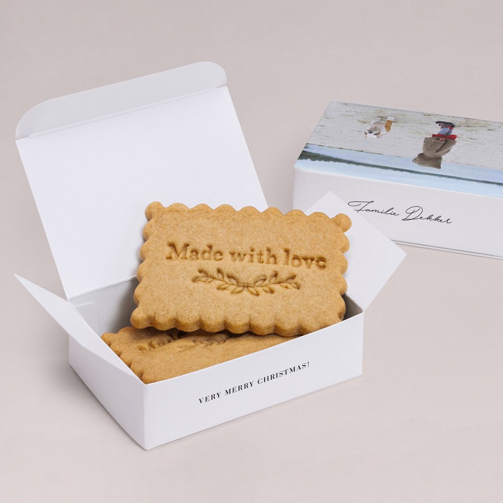 De koekjesdoos is speciaal ontworpen en gemaakt om jullie familie en vrienden te verrassen met een smakelijk cadeautje! Personaliseer het doosje met een lief berichtje, foto of jullie namen.
