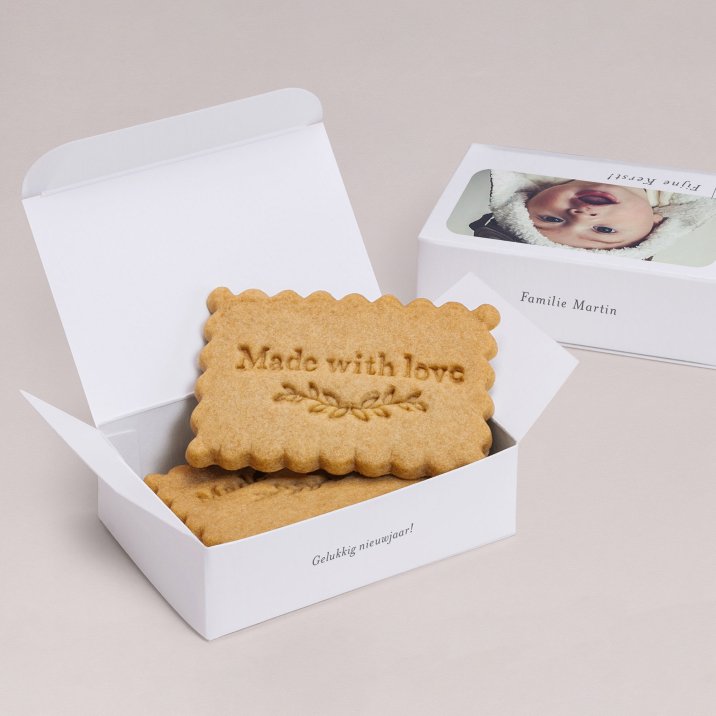 De koekjesdoos is speciaal ontworpen en gemaakt om jullie familie en vrienden te verrassen met een smakelijk cadeautje! Personaliseer het doosje met een lief berichtje, foto of jullie namen.