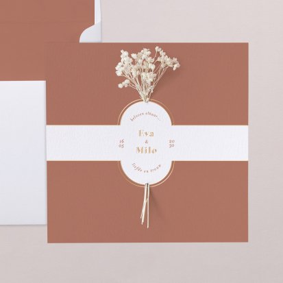 Veel van de schitterende trouwkaarten met droogbloemen zijn te voorzien van foliedruk. Laat jullie namen en de datum van de trouwdag in goud- of koperfolie op de voorkant van de uitnodiging drukken. Het folie komt op het papier te liggen, wat een diepte-effect geeft. Daarnaast is goudfolie erg populair omdat het er luxe uitziet en een romantisch gevoel toevoegt aan de trouwkaarten. Zeker in combinatie met een kalklaag krijgt je uitnodiging een exclusieve uitstraling.
